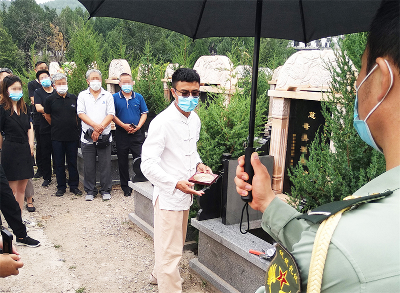 四名礼兵伴着哀乐,迈着舒缓的步伐,抬着逝者灵骨,以庄严肃穆的礼步形式走到墓穴前,由司仪打伞送灵骨入土为安,指引家属摆放供品、做上香、敬酒,行礼鞠躬仪式,举行安葬仪式。
