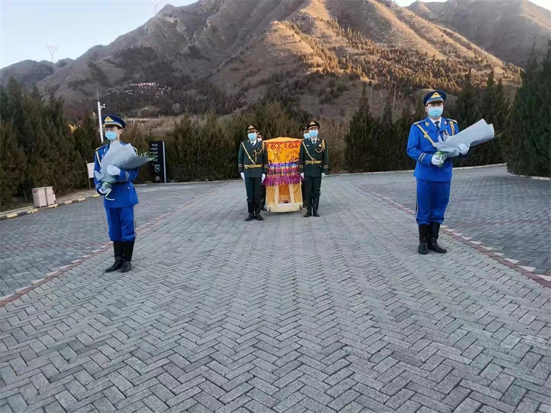 一名礼兵打伞,两名礼兵抱花,伴着哀乐,迈着舒缓的步伐,抬着逝者灵骨,以庄严肃穆的礼步形式走到墓穴前,由礼兵打伞送灵骨入土为安,司仪指引家属摆放供品、做上香、敬酒,行礼鞠躬仪式,举行安葬仪式。